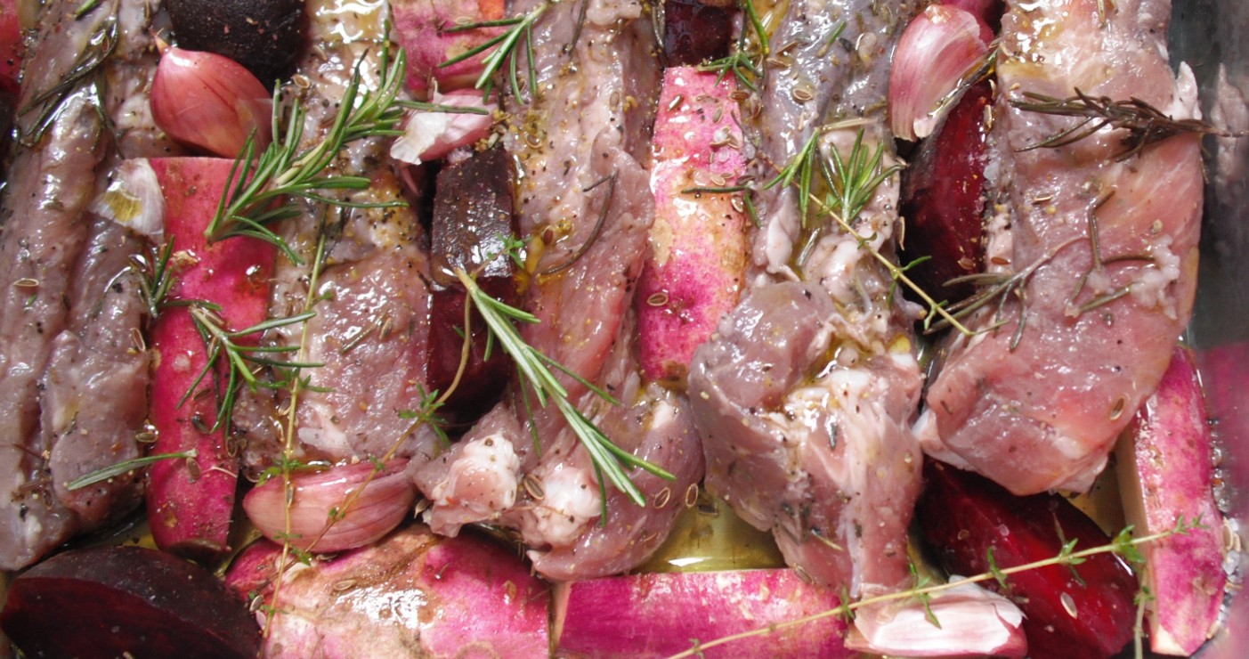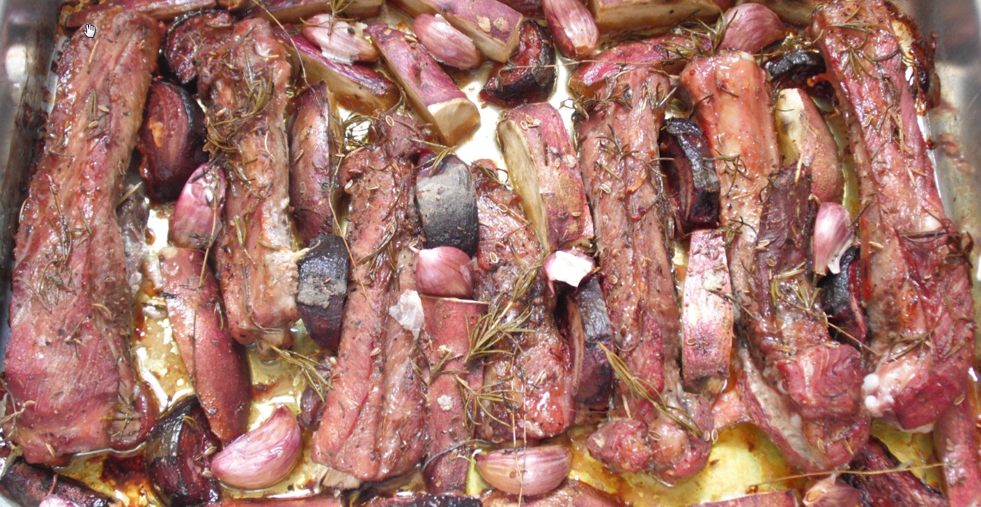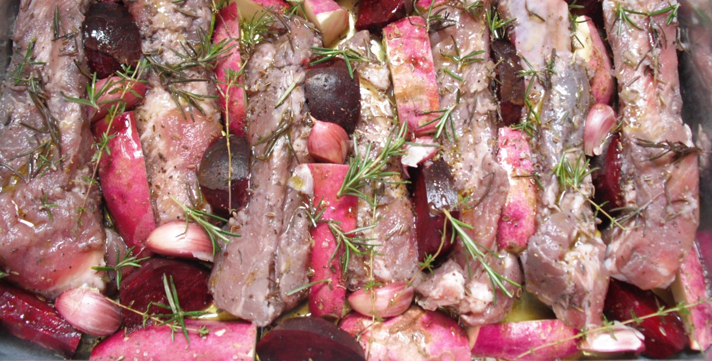 Costelinha de Porco Assada com Batata-Doce e Beterraba