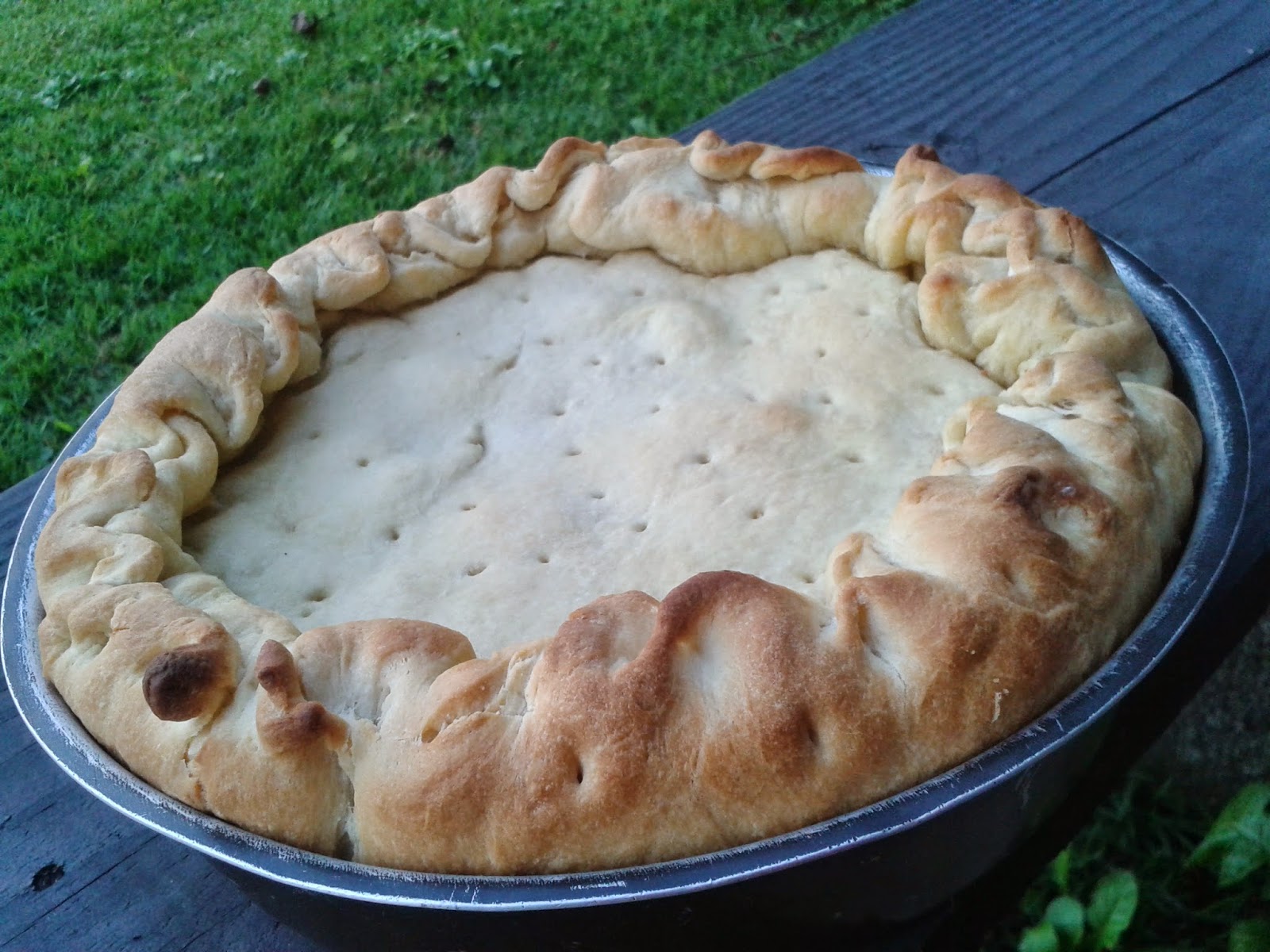 Abra o que sobrou da massa, 1/3, e cubra o calzone. Com os dedos, faça o acabamento na lateral, unindo as massas: base e cobertura, fechando bem.